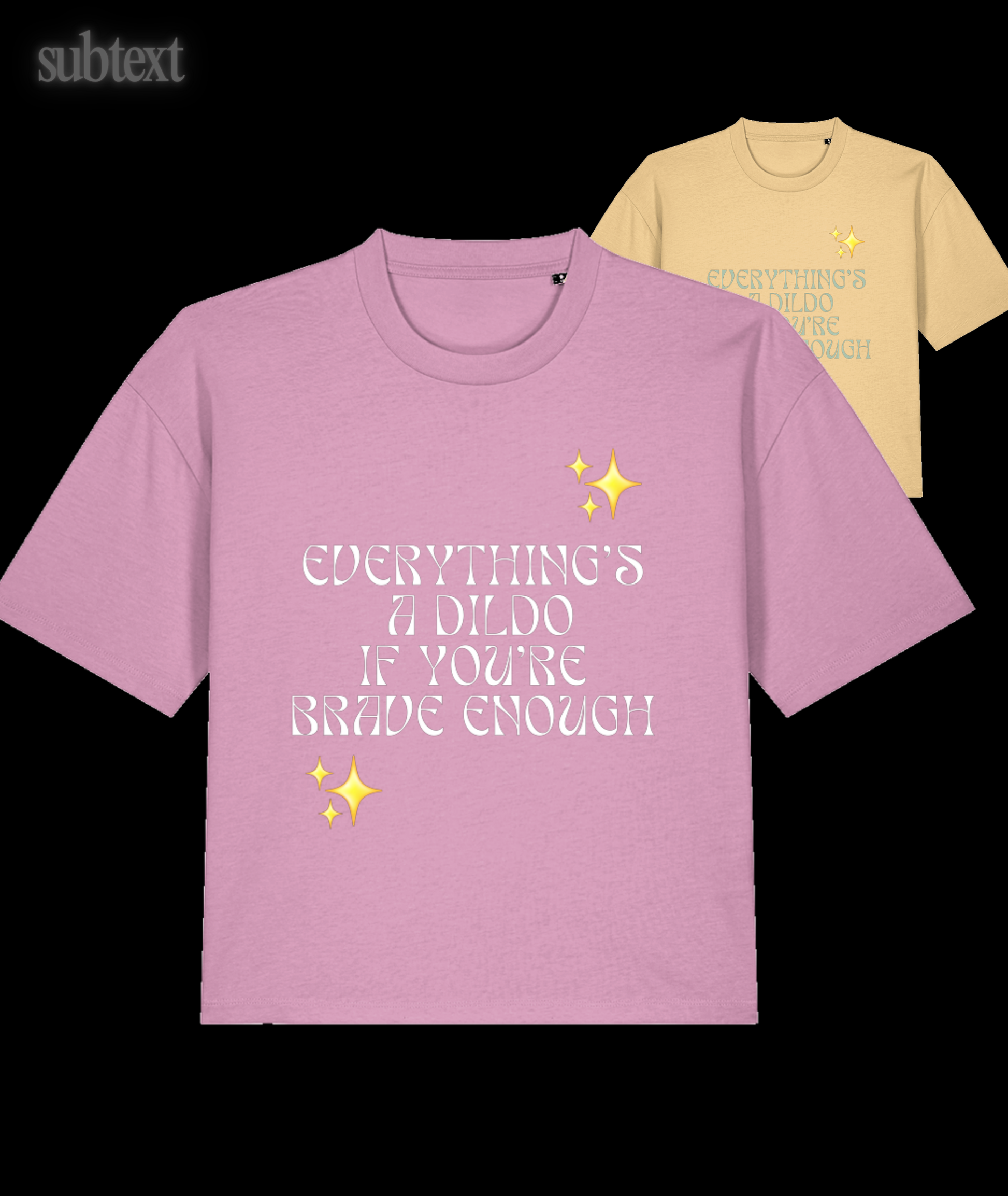 Inspirational lesbian messaging <3 <3 <3 Bold typography // Sustainable rebellion. The EVERYTHING'S A D/LDO tee in pink delivers inspirational princess cheek on premium organic cotton. Relaxed boxy fit with a slightly cropped silhouette on 100% organic cotton. Center print design with playful star accents. Ethical production.