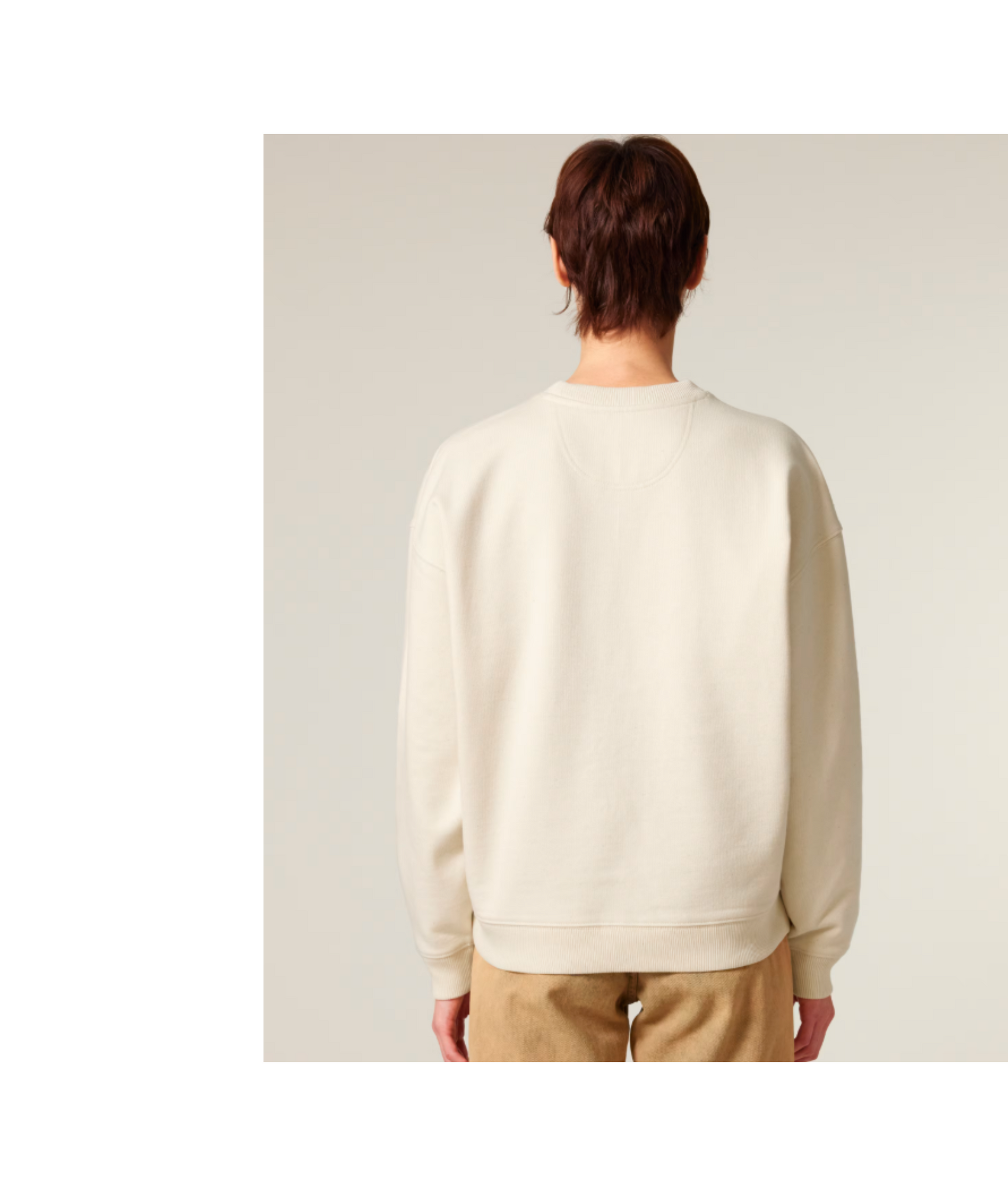 100% organic ringspun combed cotton (350 gsm) for superior comfort and sustainability Oversized relaxed fit with set-in sleeves for a modern silhouette 2x1 rib at collar, sleeve cuffs and bottom hem for a clean finish Inside herringbone back neck tape for added comfort Self fabric half moon at back neck Double needles topstitches on all seams